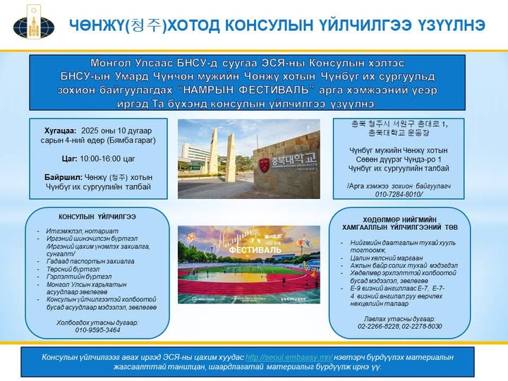 БНСУ дахь Хөдөлмөр, нийгмийн хамгааллын үйлчилгээний төв нь 2025 оны 10 дугаар сарын 04-ний өдөр Чонжү хотод зохион байгуулагдах “Намрын фестиваль” арга хэмжээний үеэр иргэд та бүхэнд явуулын үйлчилгээ үзүүлэн ажиллана.