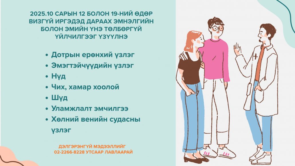 🗓 Үзлэг, оношилгоо хийх хугацаа: 2025 оны 10 дугаар сарын 12 болон 19-ний өдрүүдэд