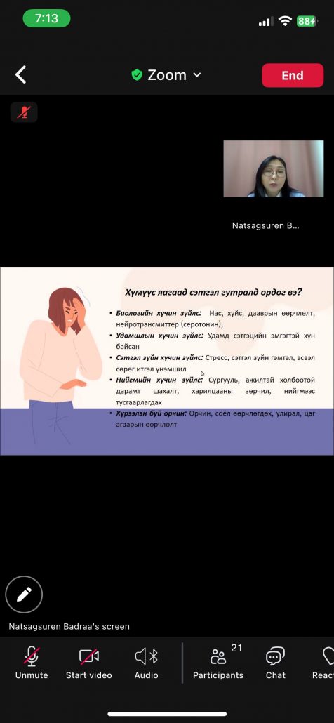 Энэ удаагийн сургалтыг анагаах ухааны магистр, сэтгэцийн эмч, сэтгэл засалч, тархвар судлаач Б.Нацагсүрэн “Ганцаардал уу? эсвэл сэтгэл гутрал уу?” сэдвээр хийж, тус сургалтаар