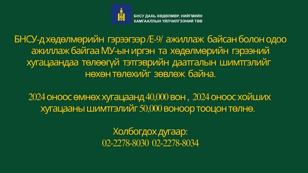 БНСУ-Д ХӨДӨЛМӨРИЙН ГЭРЭЭГЭЭР (Е-9) АЖИЛЛАЖ БАЙСАН ИРГЭД АЛБАН ЖУРМЫН ТЭТГЭВРИЙН ДААТГАЛЫН ШИМТГЭЛИЙГ НӨХӨН ТӨЛӨХ БОЛОМЖТОЙ
