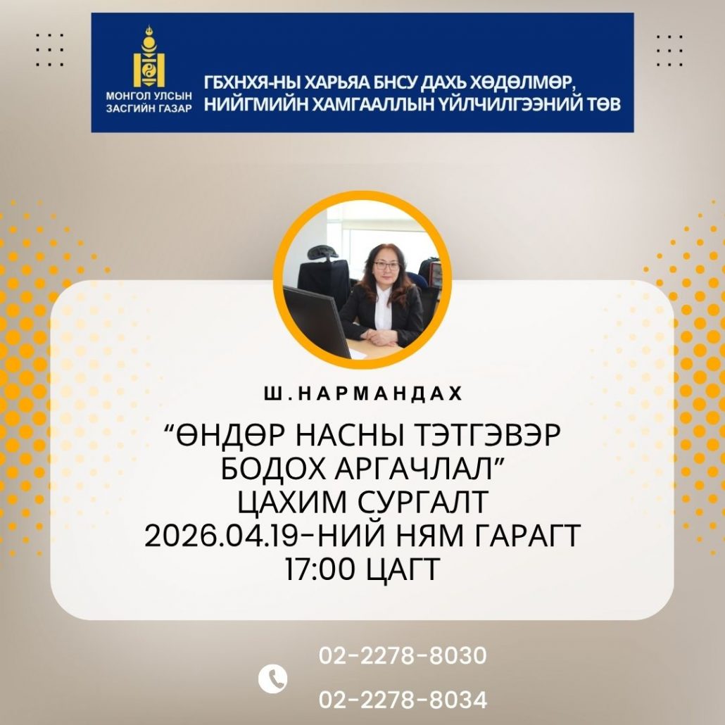 БНСУ-д ажиллаж амьдарч буй иргэддээ Монгол Улсын Нийгмийн даатгалын сангаас олгох өндөр насны тэтгэвэр бодох аргачлалын тухай сургалт, уулзалтыг Нийгмийн даатгалын тасгаас 2026 оны 4 дүгээр сарын 19-ний ням гарагийн 17:00 цагт цахим буюу зүүм хэлбэрээр зохион байгуулах гэж байна.